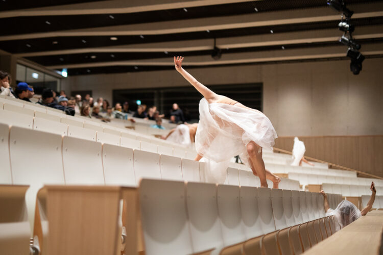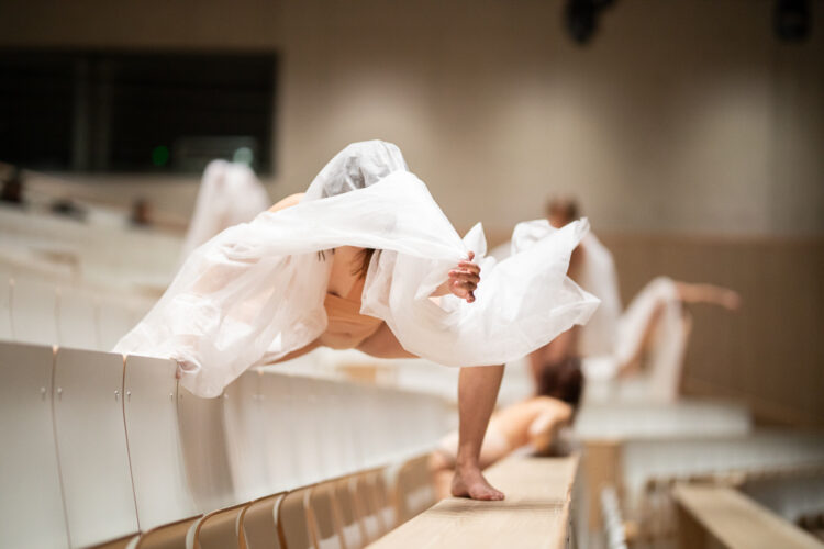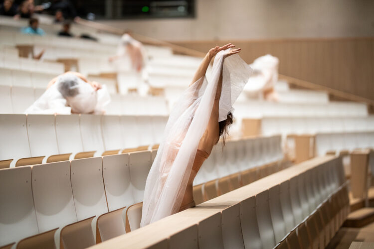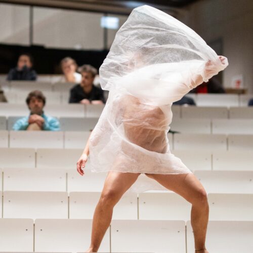 Judith Klemenc und ihre Gäst*innen verwandeln dazwischen das AudiMax in einen metaphorischen Garten, in dem Körper zu keimenden Samen werden, die sich ein-, aus- und entfalten. Unter einem schützenden Gartenvlies wachsen Körperbilder, die in Bewegung kommen und an Fragen nach queerer und feministischer Solidarität rühren.